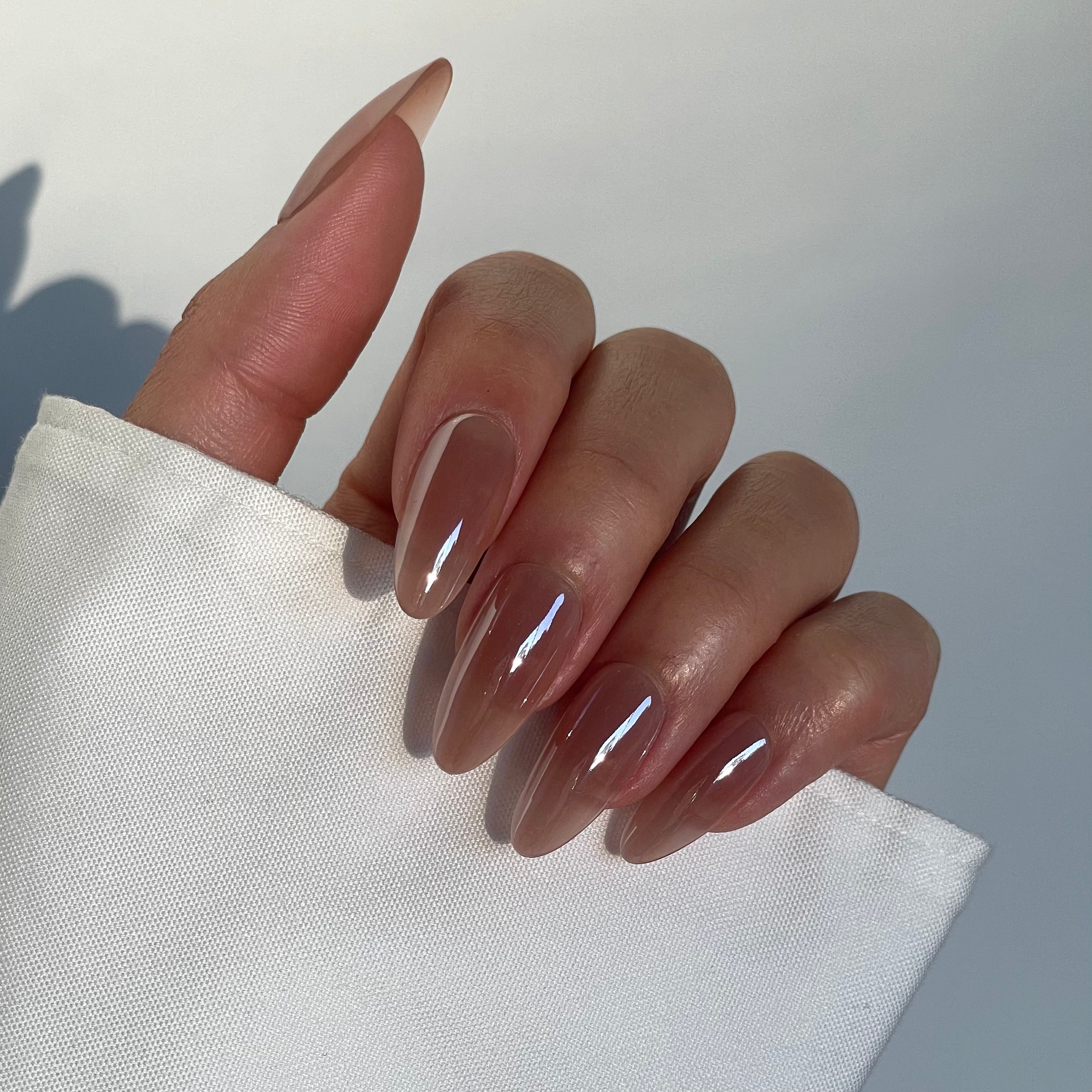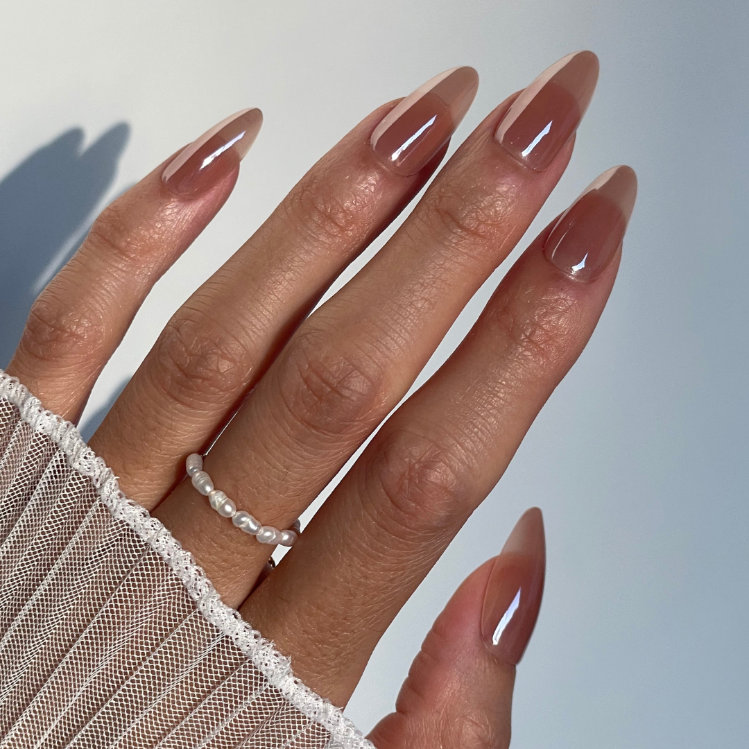 Soul is a deep tan brown glazed style in a long almond shape. Inspired by Hailey Bieber's glazed donut nails, but with a jelly-like base. This warm style is simple, sophisticated and chic.